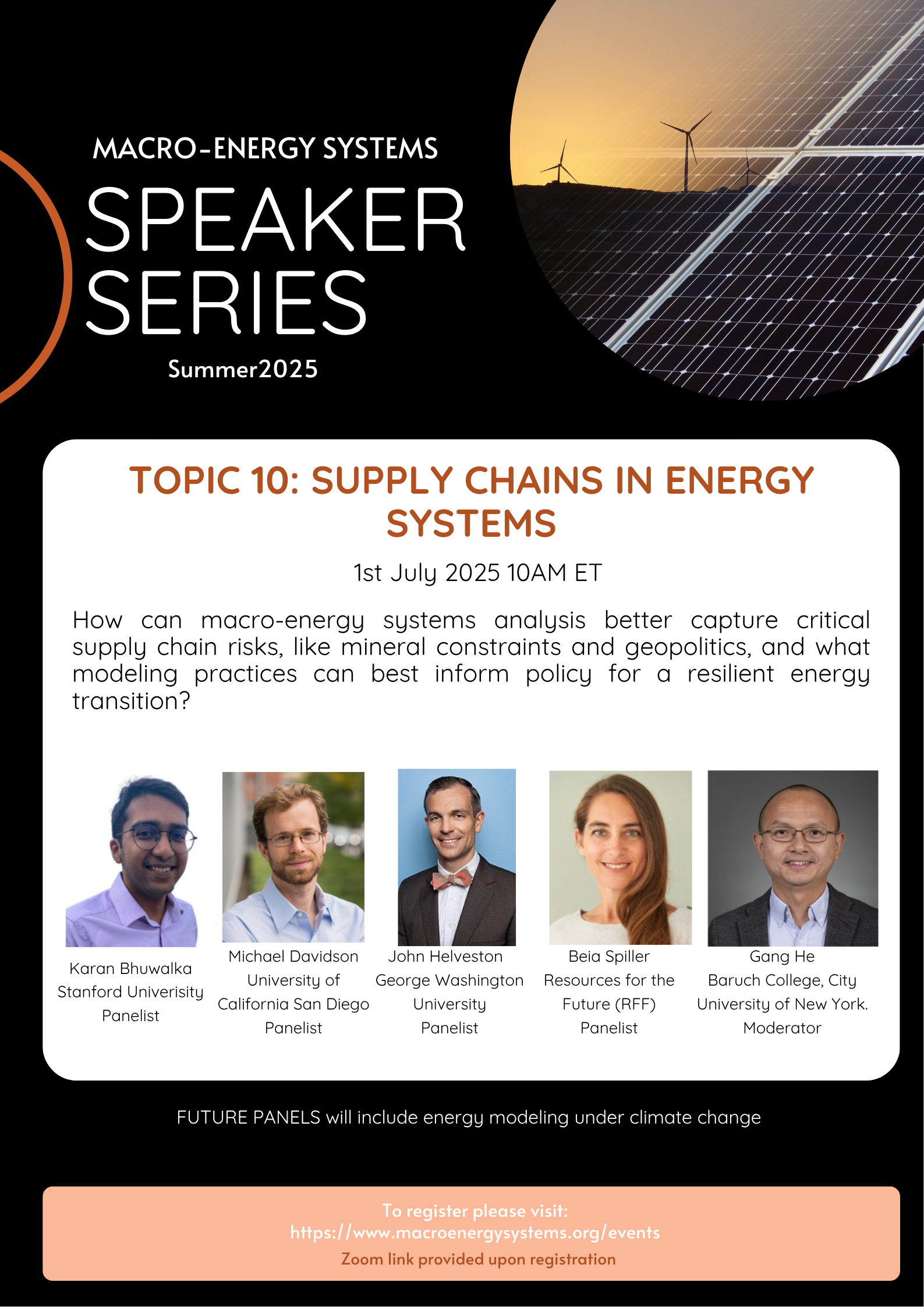This session will focus on “Supply Chains in Energy Systems.” We will explore how macro-energy systems analysis can better capture critical supply chain risks, such as mineral constraints and geopolitics, and what modeling practices can best inform policy for a resilient energy transition.
